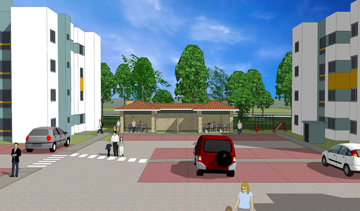 composto por oito blocos de quatro pavimentos com apartamentos de dois e